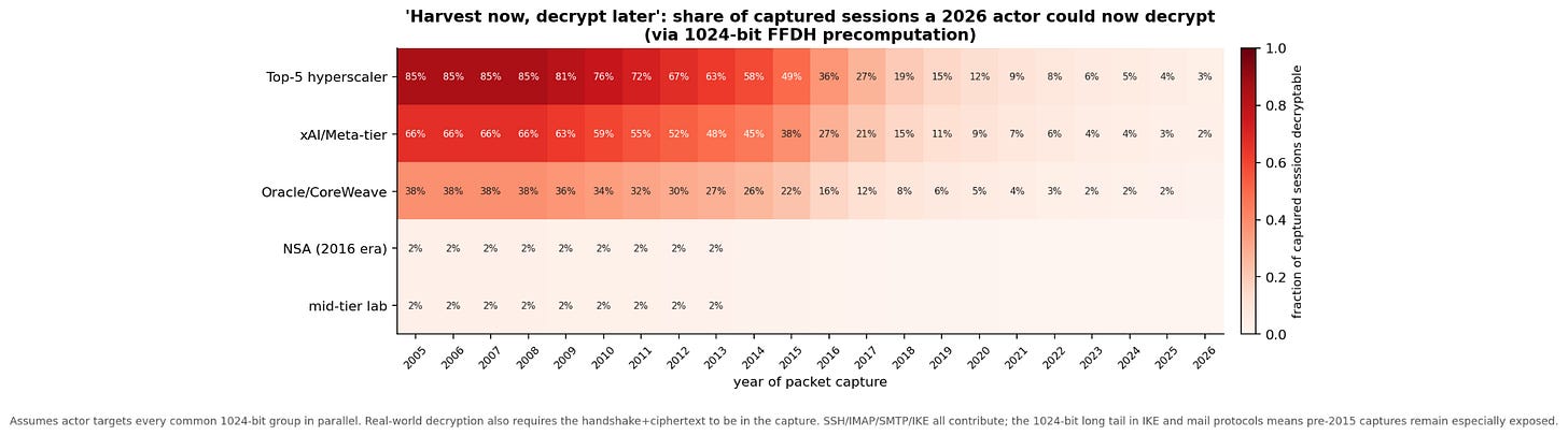 The top row (a top-5 hyperscaler, if they were so inclined) can decrypt ~75 to 90 % of internet-scale packet captures from 2005 to 2010, back when 1024-bit DH was near-universal. The figure falls gracefully as modern protocols displaced it. They can still decrypt ~20 % of 2018 captures and ~4 % of 2026 captures (mostly IKE, VoWiFi, SSH long-tail).