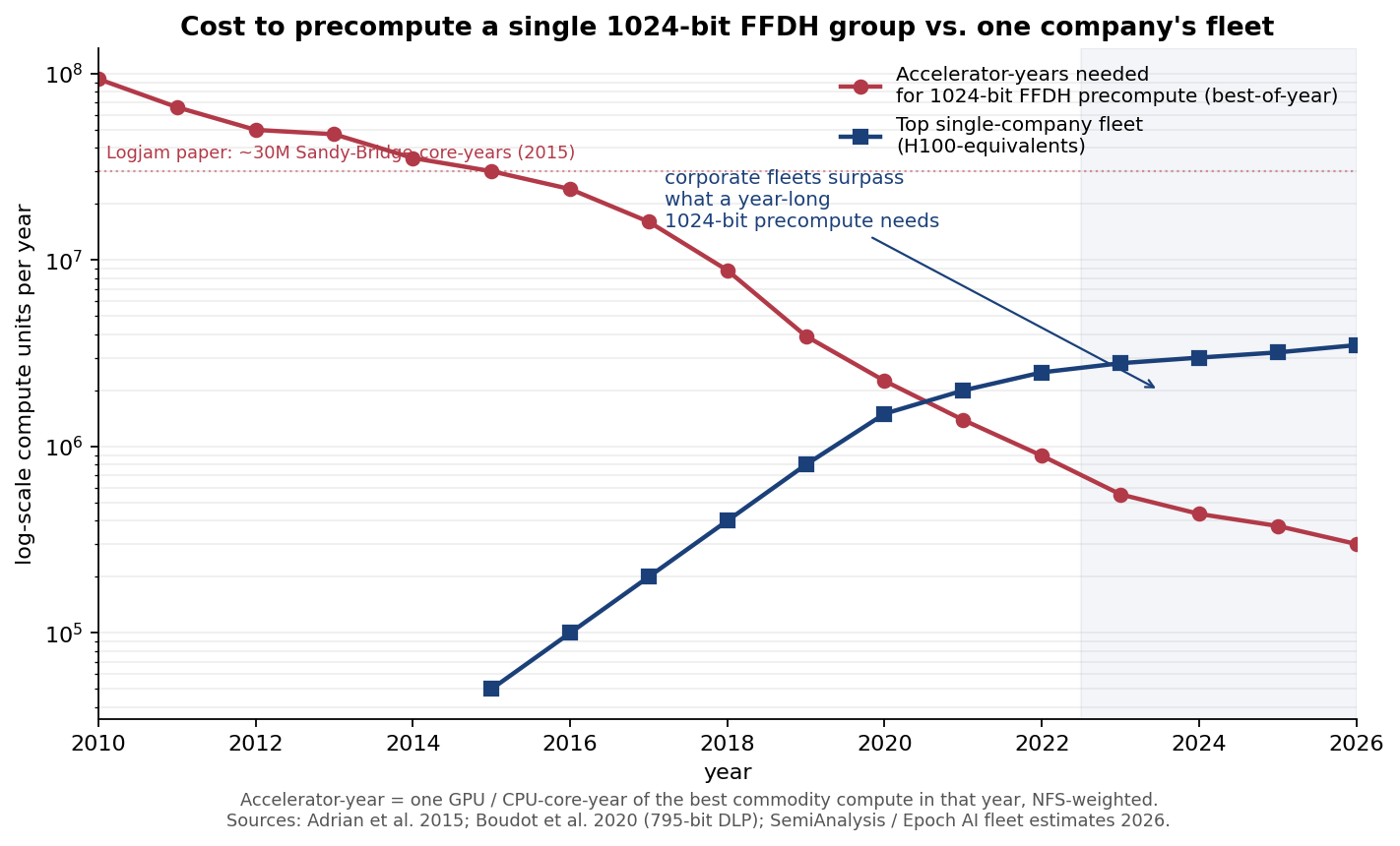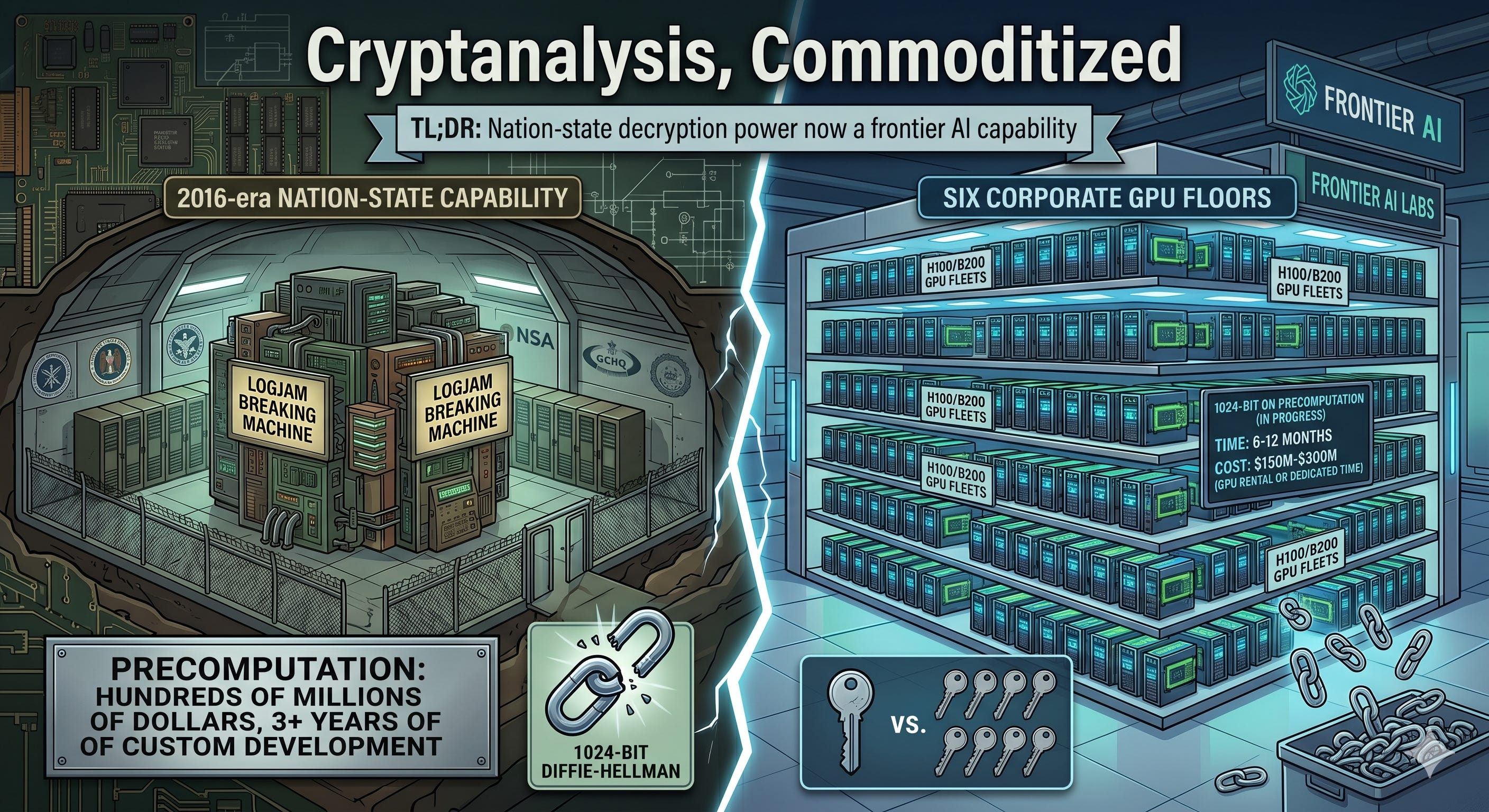 The logjam paper has been bugging me for over a decade and I finally understand why: the bitter lesson. The 2016-era nation-state capability to break 1024-bit DH is now within reach of frontier AI labs and compute corporations. The crossover happened around 2022 to 2023. The capability is now inside the core business fleet of roughly six companies, and implicitly inside the budget of anyone who can rent $150M to 300M of GPU time for a quarter.