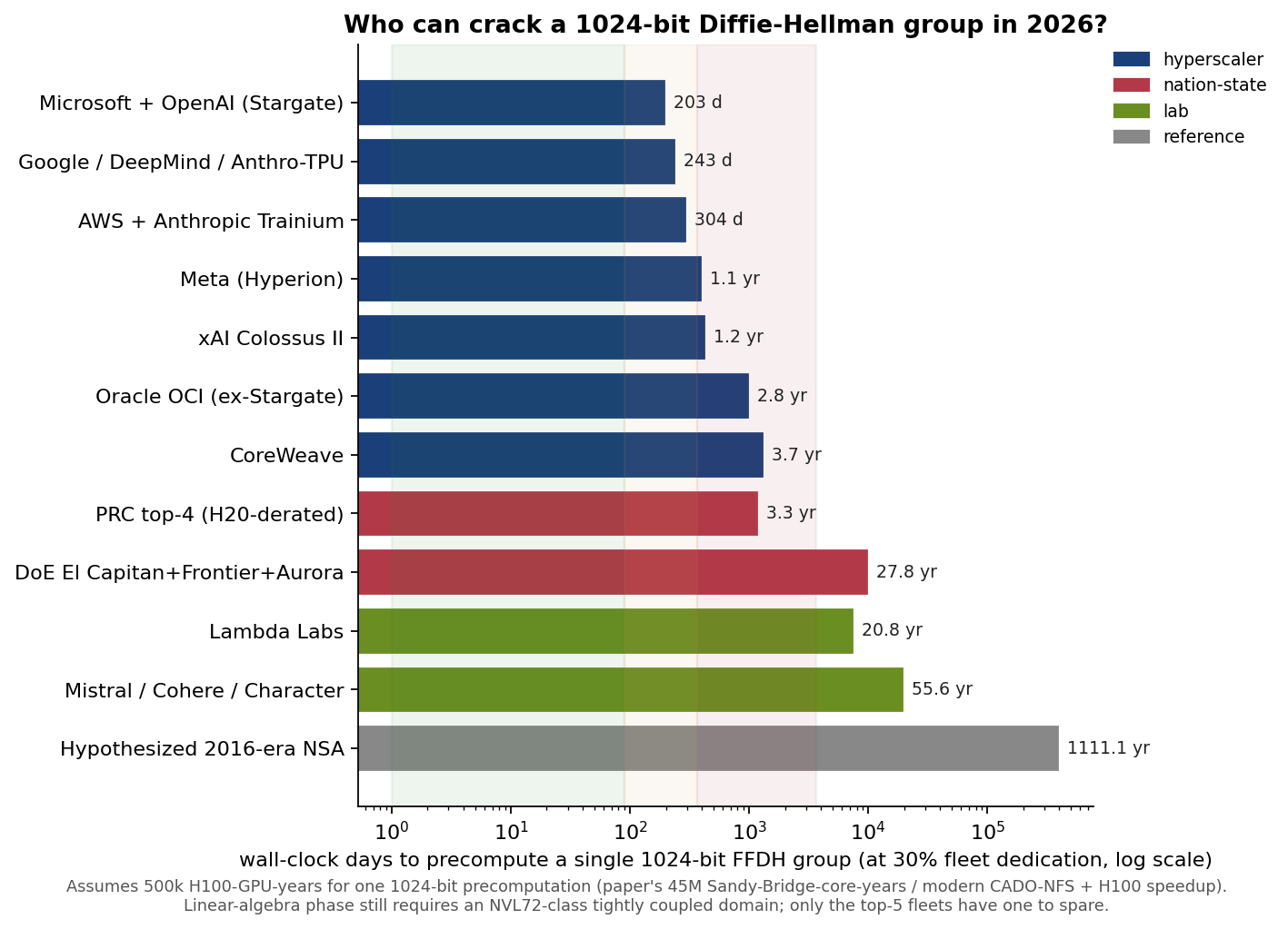 “Nation-state-only capability” is no longer a defensible threat-model category for 1024-bit FFDH. Anyone quoting the 2015 Logjam paper’s nation-state framing in 2026 is citing out-of-date economics. The right framing: “any actor with $150 to 300 M of quarterly GPU budget, or a friendly relationship with one of six cloud CEOs.”