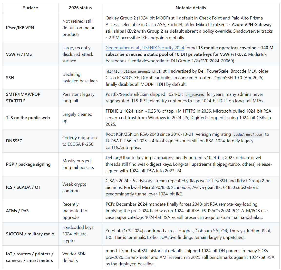1024-bit crypto didn’t actually go away. TLS-on-the-web grew up. IKE/IPsec VPNs, SSH on embedded gear, SMTP/STARTTLS, DNSSEC on ccTLDs, VoWiFi signaling, industrial VPN concentrators, and ATM remote-key-loading did not. A meaningful fraction of globally captured pre-2020 packet traffic still relies on 1024-bit FFDH.