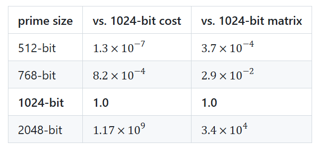 2048-bit is about one billion times harder than 1024-bit. That rules it out of classical reach forever and pushes the 2048-bit (and ECDH) threat model into quantum, which is exactly the reason the industry is racing to deploy ML-KEM-768 hybrid KEMs today. Not because classical NFS is catching up to 2048.