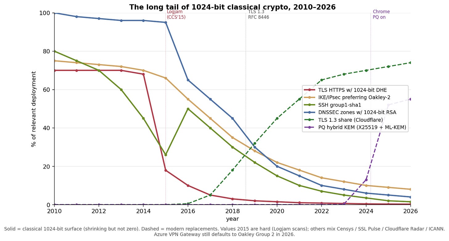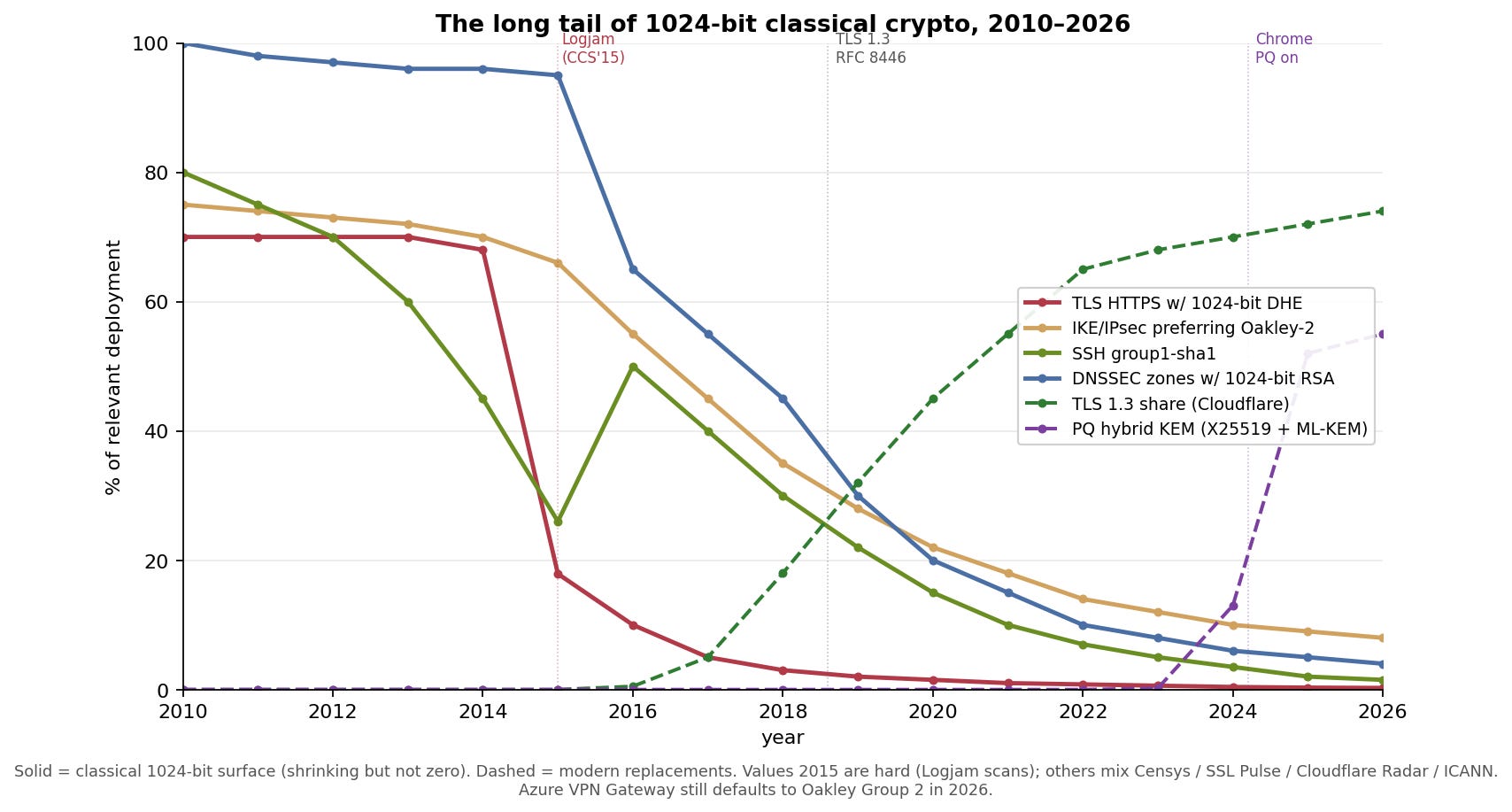 Solid lines are 1024-bit surfaces. Dashed lines are the replacements. TLS-HTTPS 1024-bit DHE collapsed (browsers raised the floor, TLS 1.3 eliminated FFDHE). IKE’s Oakley-2 decline is far more gradual, and still around 8 % in 2026 because the default on a major public cloud VPN product hasn’t moved. SSH group1-sha1 is a consumer-router story. DNSSEC RSA-1024 is a slow, orderly retirement. The bright spots are TLS 1.3 share and the explosive post-quantum hybrid KEM curve: Cloudflare Radar’s 2025 Year in Review shows the share of human-generated HTTPS traffic protected by a hybrid PQ KEM rose from about 29 % at the start of 2025 to 52 % by early December 2025, a jump concentrated around iOS 26’s release.