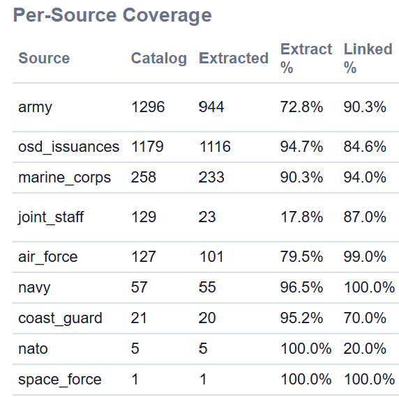 Scope / caveats: I only used sources that didn’t require a CAC, and I stopped improving the PDF extraction when it was “good enough” to satisfy my curiosity.