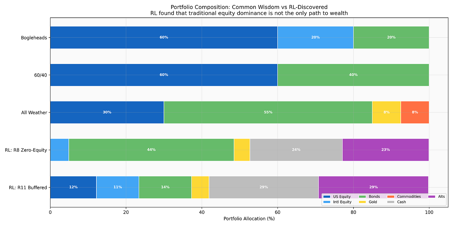 I ran a reinforcement learning (RL) search. The RL agent starts with random allocations, measures each against the compound-scenario engine using a simplified reward function, and evolves toward configurations that survive better. Eleven rounds of evolution, roughly 55 million candidate allocations evaluated.