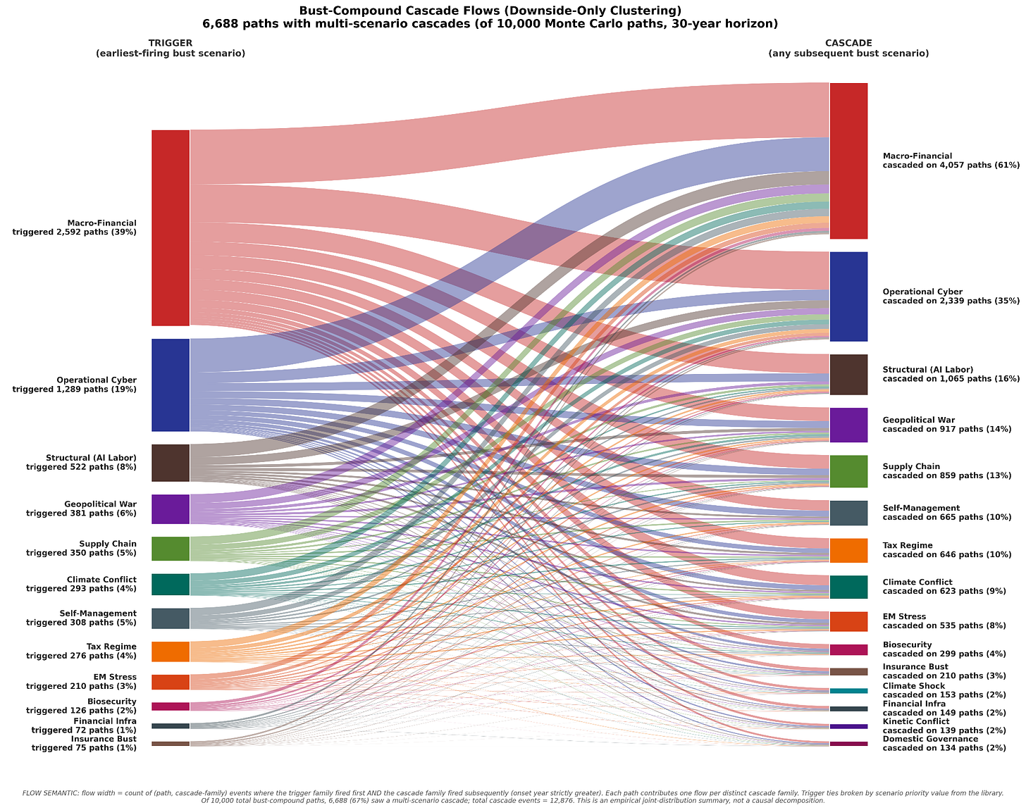The way society and government respond to one event often creates the conditions for the next. A macro-financial crisis makes tax-regime shocks and structural disruptions more likely. Geopolitical wars spill into supply-chain disruption and cyber operations. Climate shocks feed into resource conflicts and biosecurity risks. I built a spillover model, family-to-family probability multipliers grounded in historical sequences, and ran 10,000 Monte Carlo paths through three modes: bust-only (downside clustering), boom-only (upside clustering), and mixed (both).