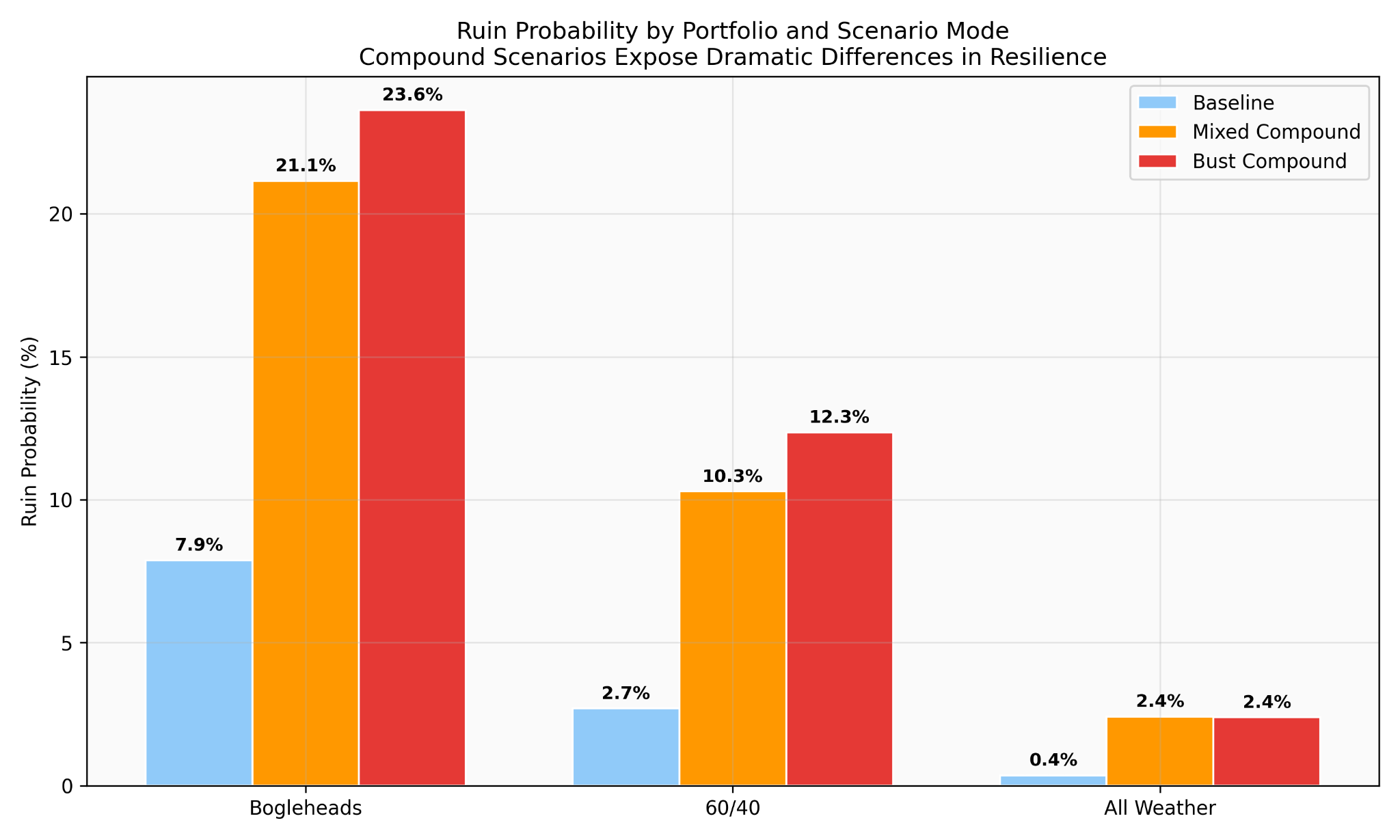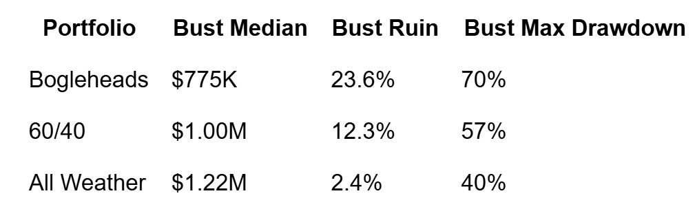 “Ruin” here means less than ten years of spending money left at the end of the horizon. Under downside-clustering conditions, the Bogleheads portfolio ends in ruin on roughly one path in four. The Classic 60/40 on roughly one in eight. Dalio’s All Weather on one in forty.