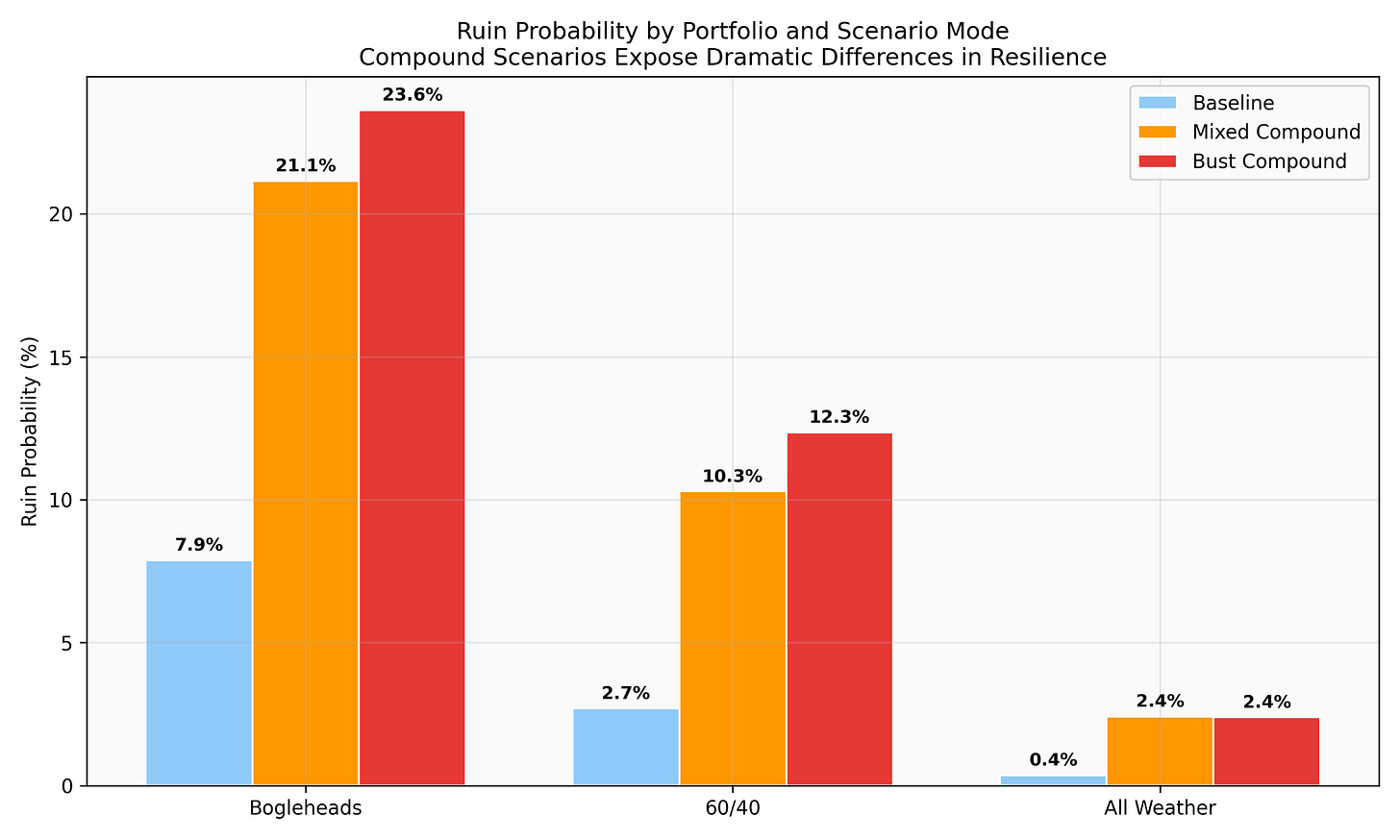 Compound scenarios change the answer. Individual black swans are manageable. Clustered ones, with cascading dependencies, are what break common-wisdom portfolios. The difference between the three retirement portfolios under baseline conditions is noise. Under compound-scenario conditions it’s an order of magnitude in ruin probability.