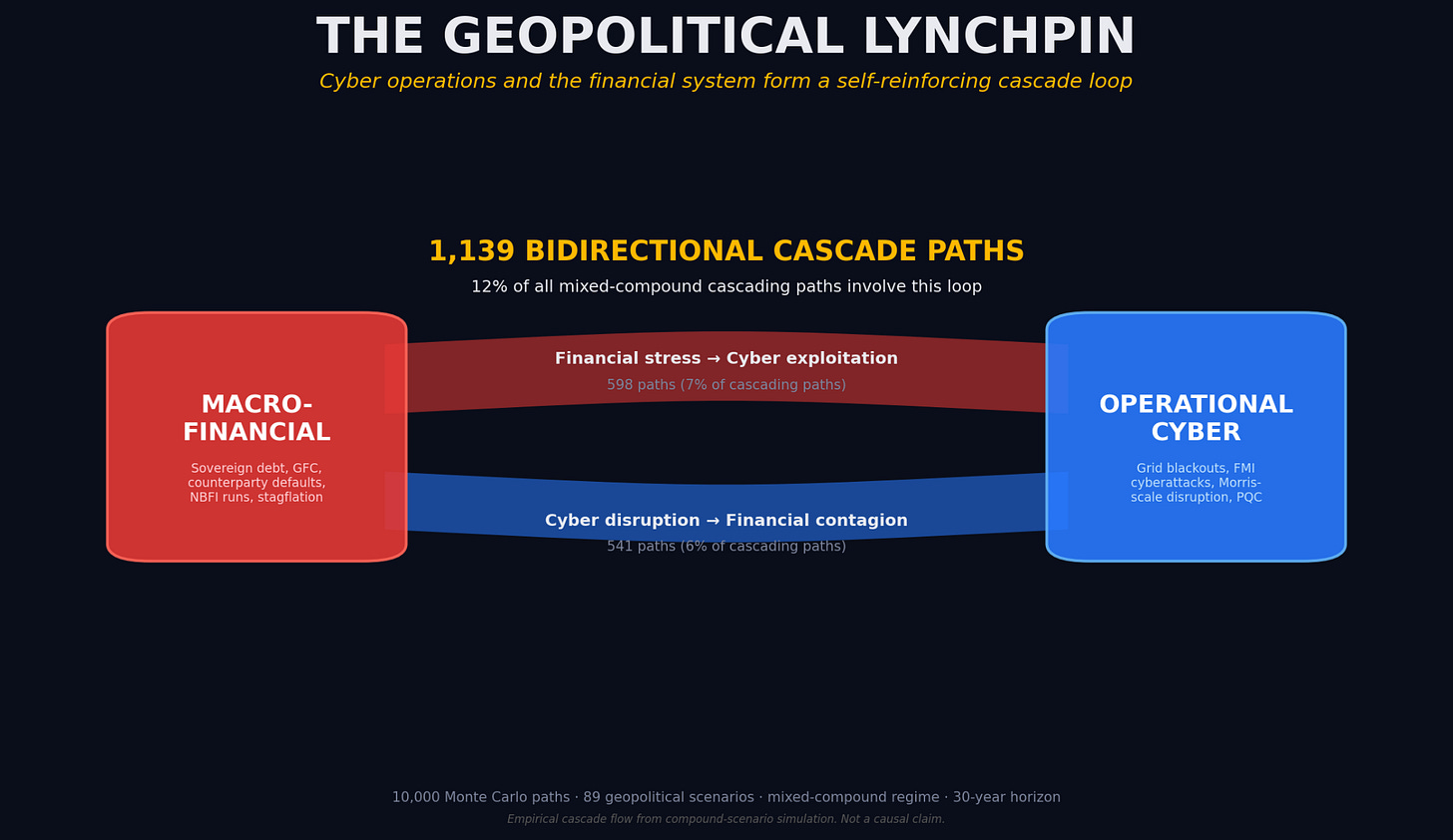 The Sankey showed that macro-financial is the hub of the global cascade network. It showed that operational cyber is the most common bridge into a macro-financial cascade. And it showed that the dominant three-step sequence across the entire simulation is macro → cyber → macro. Read that the other way around: a cyber attack on the financial system plumbing is how you trigger a cascading failure in the world economy. Not metaphorically. As an empirical output of a simulation calibrated against the institutional literature.