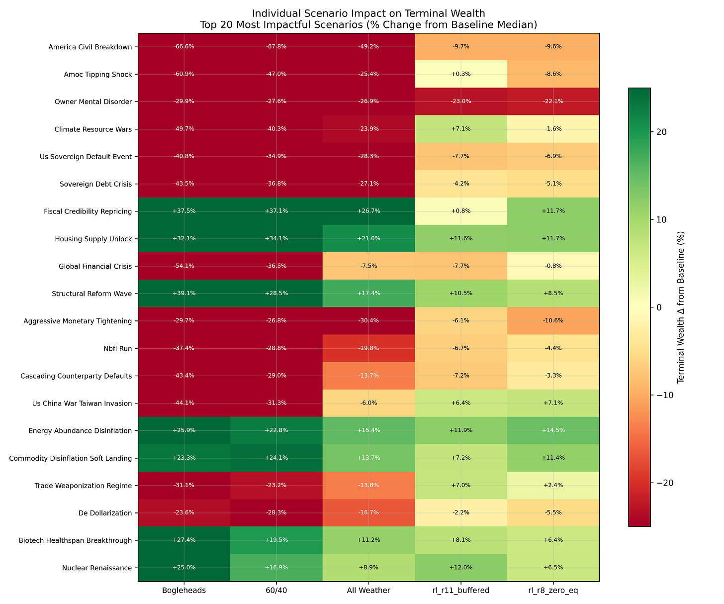 The worst individual scenarios for all three portfolios are geopolitical and institutional: civil breakdown in America (a specific institutional-failure scenario drawn from RAND and CSIS modeling, not a partisan projection), abrupt AMOC climate tipping, global financial crisis, and U.S. sovereign default. The first two produce 60%+ drawdowns in Bogleheads. All Weather takes them at roughly half the magnitude.