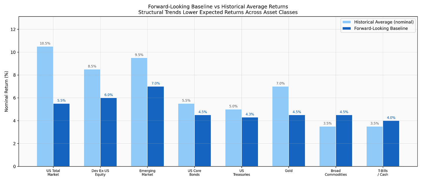 The standard move in financial planning is to assume historical returns, roughly 10.5% nominal for U.S. equities, 5.5% for bonds, will continue. That assumption is built on a world of strong institutions, stable trade, manageable sovereign debt, benign demographics, and a relatively quiet geopolitical backdrop. Every one of those is visibly changing.