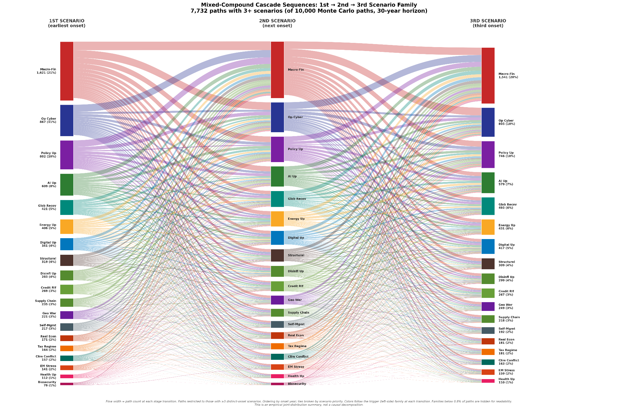 In the bust-only mode, macro-financial plumbing is the central hub. It triggers first on 76% of cascading paths and appears as a downstream consequence on 61%. The single most common three-step sequence across the mixed-mode simulation is macro-financial fires first, operational cyber fires second, macro-financial fires again. Macro-financial appears in all top-10 three-step sequences.