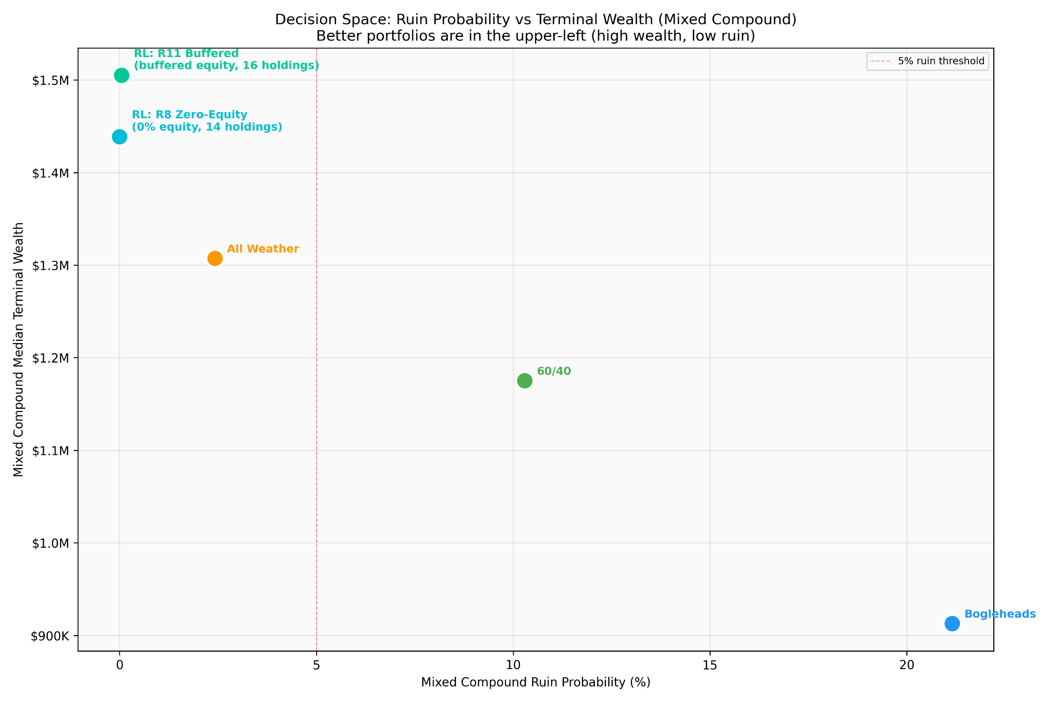 Both achieve effectively zero ruin probability and bust-compound medians 78–80% higher than Bogleheads. The choice between them is a policy preference: lower drawdown vs slightly higher upside capture.