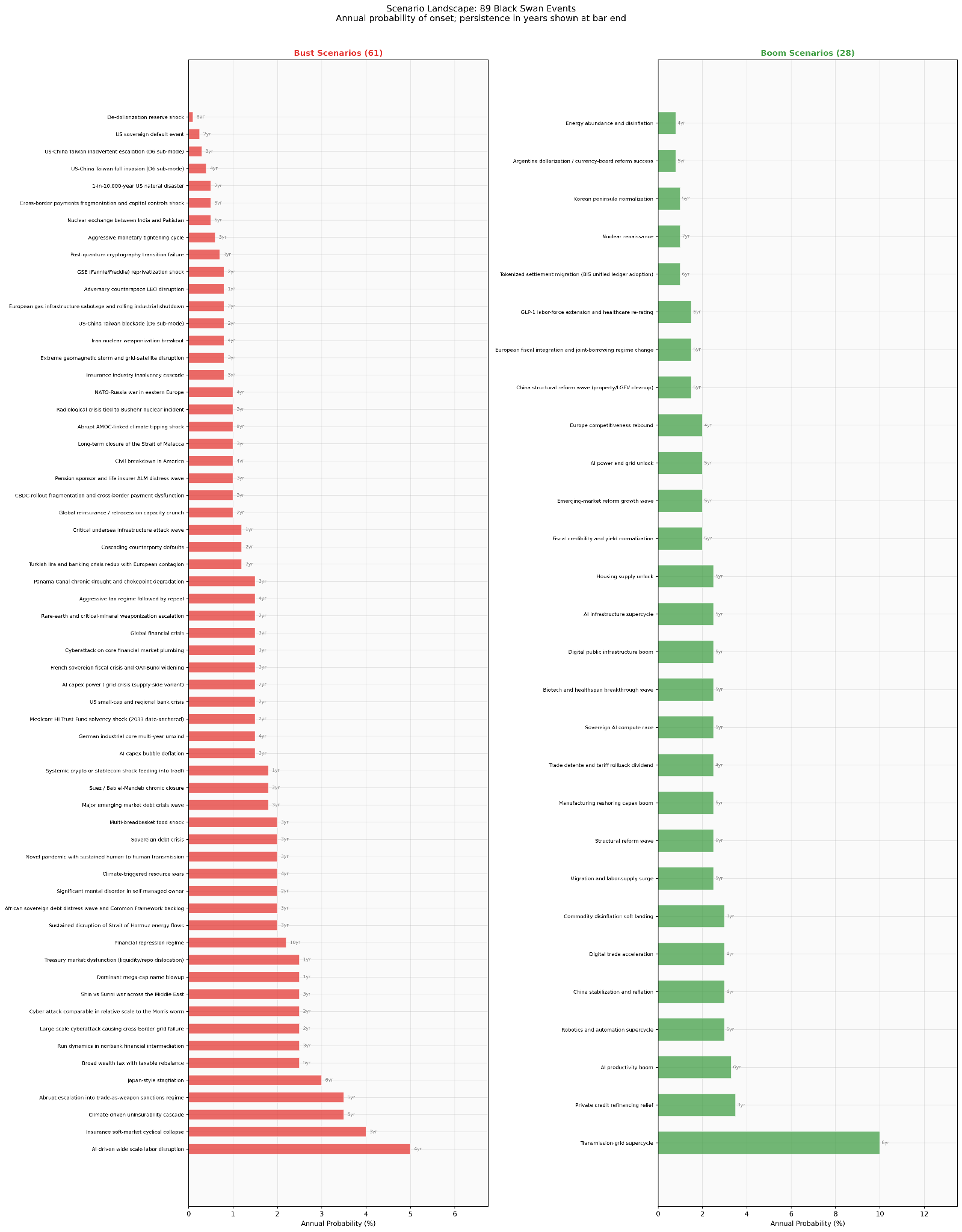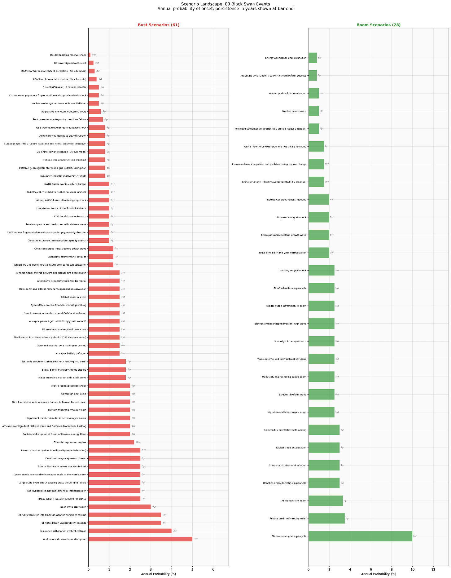 I modeled 89 scenarios (61 busts, 28 booms) drawn from the same research base. Each has a calibrated annual probability, a persistence duration (1 to 10 years), and a shock profile across all 72 asset categories. Annual probabilities range from 0.5% for a nuclear exchange to 10% for a transmission-grid infrastructure supercycle. Scenarios are what the literature models, which means they carry an implicit bias toward what foundations, donors, and governments were worried enough to fund studies on. That’s a limitation, but it’s also a feature: these are the events that institutional researchers thought were worth calibrating.